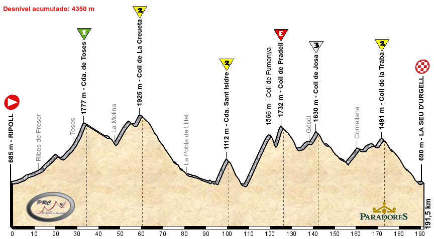 La primera propuesta es la más dura de las tres, con más de 4300 m de desnivel acumulado, y sobre todo un durísimo puerto como Pradell que convierte a la etapa en imprevisible, con 100 km finales sin un metro de llano y la posibilidad de ataques lejanos que den sus frutos y muchas tácticas de equipo. Ya desde Ripoll la carretera se muestra ascendente, aunque no es hasta Ribes de Freser donde comienza oficialmente la subida a la Collada de Toses. Es una subida tendida en su inicio, hasta que se toma el desvío hacia Toses para encarar la carretera vieja y sus tremendos 4,4 km finales al 8,7%. Entonces se baja de forma suave hasta la estación de esquí de La Molina, para volver a subir durante 6,8 km al 6%, afrontar un descansillo y un repecho final antes de coronar el Coll de la Creueta. Su larga bajada completa un inicio de etapa duro, perfecto para la formación de escapadas numerosas y que la carrera se vuelva «loca».
