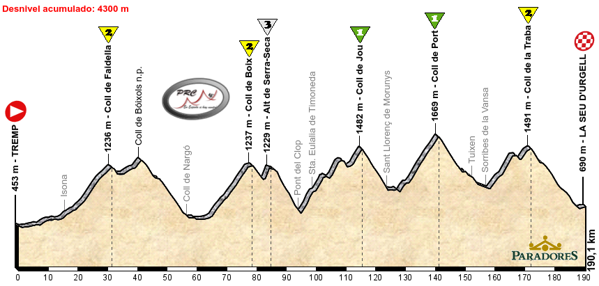 Esta última propuesta se aleja de la alta montaña presentando un perfil con puertos de menor entidad, pero todos perfectamente encadenados convirtiéndola seguramente en la más atractiva de las tres. La carrera sale de Tremp por un falso llano ascendente hasta que en Isona comienza el primer puerto del día, el Coll de Faidella con 12,7 km al 4,6%. Tras una corta bajada se sigue hasta coronar el Coll de Bóixols, un falso llano que termina con 1,8 km al 5%. Tras un revirado descenso hasta Coll de Nargó llegan las rampas del Coll de Boix y sus 12 km al 5,5%, al que de nuevo sigue rápidamente otro puerto, Serra-Seca de 1,7 km al 7,8%.