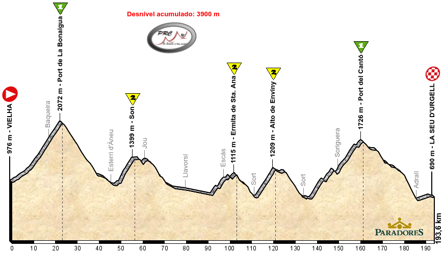 Saliendo de Vielha comienzan ya las rampas del Port de La Bonaigua, 23,2 km al 4,7% hasta coronar por encima de los 2000 m de altitud, de nuevo una salida dura donde ver una bonita lucha por formar la escapada buena. Se baja por Borén hasta Esterri d’Aneu buscando la nueva variante de La Bonaigua como inicio de la subida a Son, consiguiendo así un extra de dureza, totalizando 5,8 km al 7%. El tramo más sencillo de la etapa es el llano favorable por Llavorsí dirección Rialp.