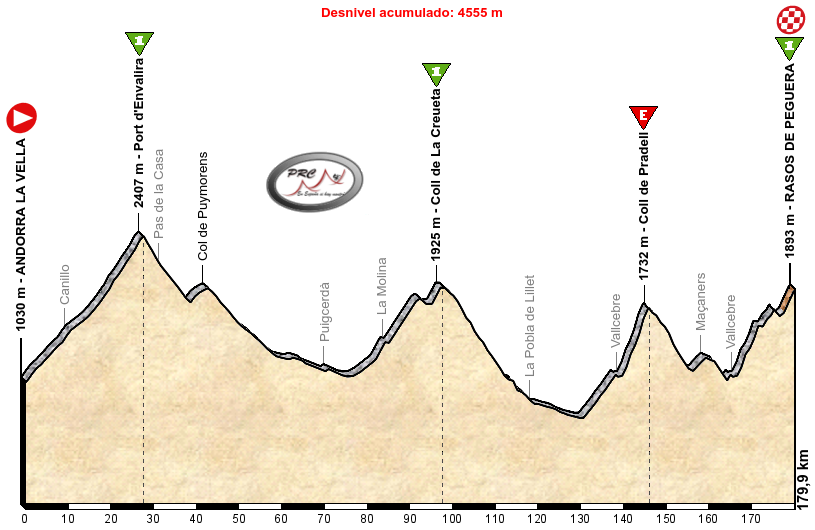 De nuevo el descenso es largo hasta La Pobla de Lillet, y tras un tramo favorable hacia Guardiola de Berguedá se sube al Coll de Pradell por su vertiente de Vallcebre. El primer tramo es suave, 7,5 km al 5,4%, pero una vez en Vallcebre se afronta el tramo durísimo al completo. Hablamos de nada menos que 5,5 km al 11%, con rampas del 23%. Su cima está a 34 km de la meta, una buena distancia para atacar en un terreno que, por dureza y falta de llano, permite hacer camino en solitario poniendo difícil a los gregarios controlar la situación.