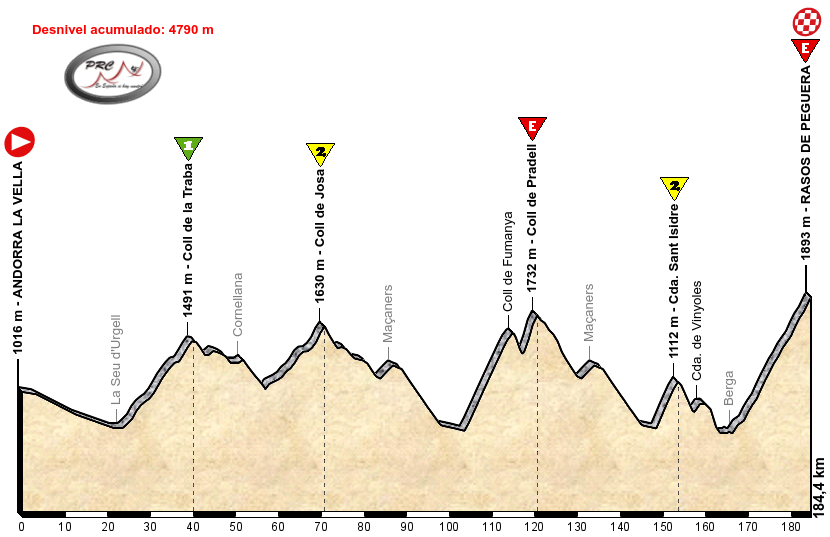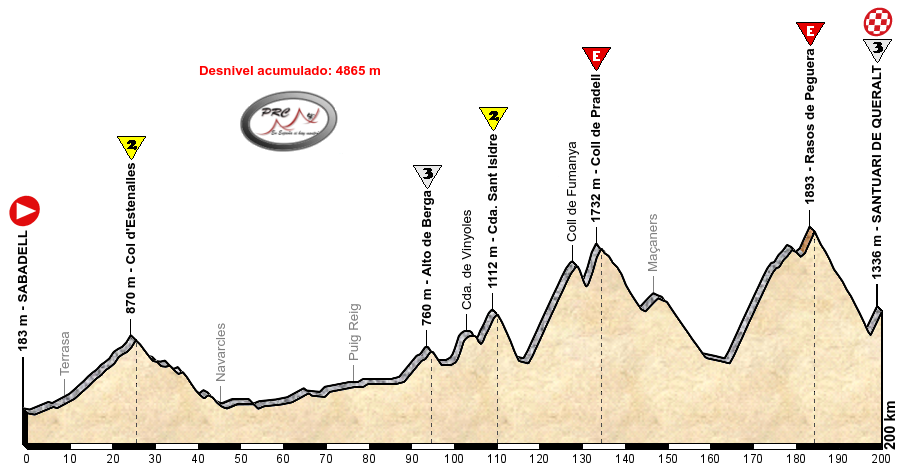 Pero será en la espectacular subida de Rasos de Peguera por Vallcebre, irregular pero muy dura, donde los ciclistas se «jueguen los cuartos». Un puerto de 22 km, más de 1300 m de desnivel acumulado, rampas máximas del 23% y tramos de tierra es un grandísimo puerto que destacaría en cualquier recorrido del Giro o Tour, que capta la atención de la afición y los medios y que a poco que los ciclistas pongan de su parte debería regalar un espectáculo memorable, máxime con su cima a 15 km de la meta, unos kilómetros que pasarán volando al ser en su mayoría de rápido descenso, para rematar este gran final con un corto repecho final tan de moda hoy en día, de 2,5 km al 8% hasta el «Balcón de Cataluña» en la Sierra de Queralt.