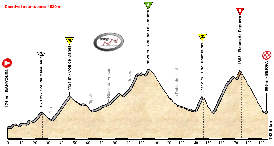 La propuesta final se acerca al Berguedá desde el oeste, concretamente desde Banyoles, final habitual de La Volta. Y presenta dificultades desde el inicio, porque hasta Olot se afronta la carretera del Coll de Caselles, una continua sucesión de repechos y descansos a través de La Garrotxa. Pero al salir de Olot la cosa se pone más serie con el Coll de Canes, 13 km al 5,4%.