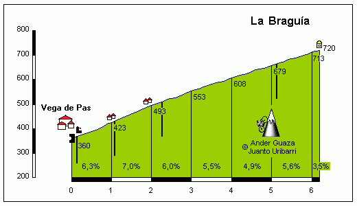 • Puerto de la Braguía, 2ª (km 128,1):  725 m – 6,1 km – 6,3 %