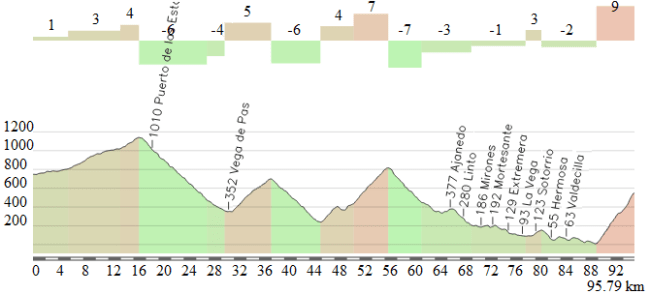 • Alto de la Cabruñana, 3ª  (km 44,5):  375 m – 5,2 km – 6,6 %