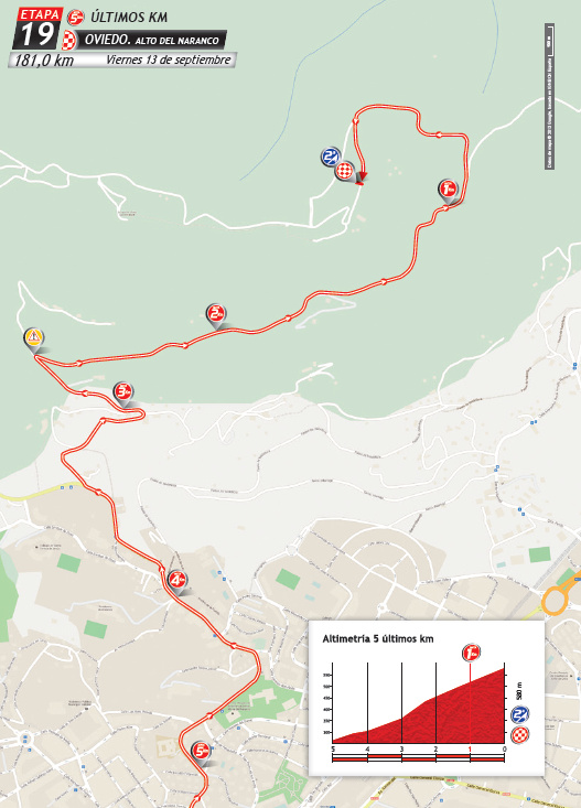 19ª ETAPA (Viernes 13 de septiembre):  SAN VICENTE DE LA BARQUERA – OVIEDO/ALTO DE NARANCO  (181 km).  Info oficial / Últimos kmmapa llegada