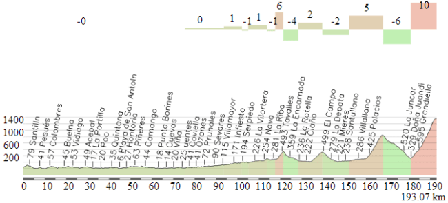 El tríptico de finales en alto de la última semana se inicia con una dura etapa de media montaña con llegada en Peña Cabarga, destacando los puertos de la Braguía y el Caracol antes de la explosiva subida final, con varios km enteros al 10% y rampas máximas de hasta el 19%. Y atención también a los descensos, que si llueve podrían ser tan importantes como las subidas. Una etapa importante para la general, pudiendo haber diferencias entre los favoritos aunque salvo improbable batalla desde lejos no de muchos segundos.