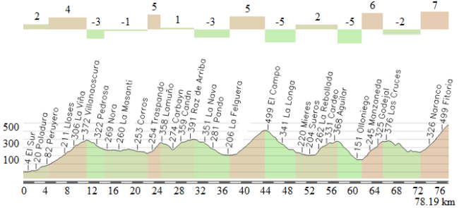 • Alto de La Fallona, np (km 21):  270 m – 5,2 km – 5 %
