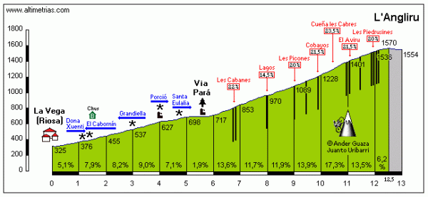 La subida más directa al Angliru parte desde la localidad de La Vega, capital del concejo de Riosa, con unos primeros km muy constantes en torno al 8%, aunque con puntas del 14% al llegar a Porció. Poco después se alcanza Viapará, con un descansillo de casi un km. Sin embargo, a partir de ahí se acaban las bromas, con 6,5 km a más del 13% de media. Aunque todo este tramo final es durísimo, sin bajar casi nunca del 10%, hay dos zonas que destacan especialmente: Les Cabanes, una rampa en zig-zag de 400 m al 19%, con máximas del 22%; y cerca del final la Cueña les Cabres, una recta brutal donde la pendiente se dispara por encima del 20%, con 300 m al 22% de media y puntas que llegan a rozar el 24% -> perfil con tramos detallados. Y no se trata de una zona aislada, ya que el km donde se encuentra la Cueña alcanza la espectacular media del 17,5%, incluyendo 800 m al 19%.