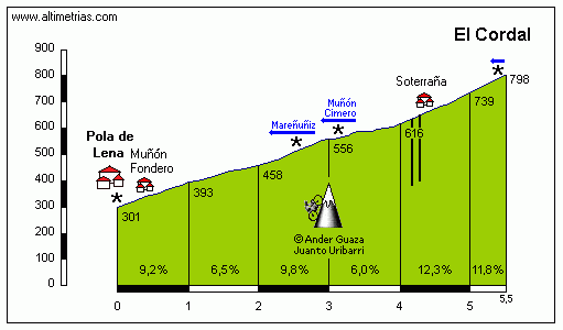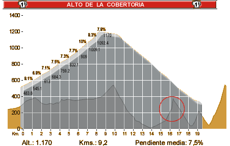 - Alto del Cordal/La Soterraña, 1ª (km 120,9): 780 m – 5,3 km – 9,6 %