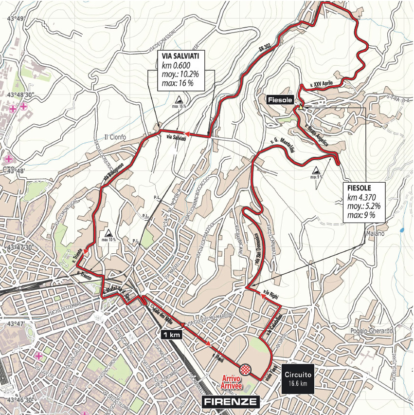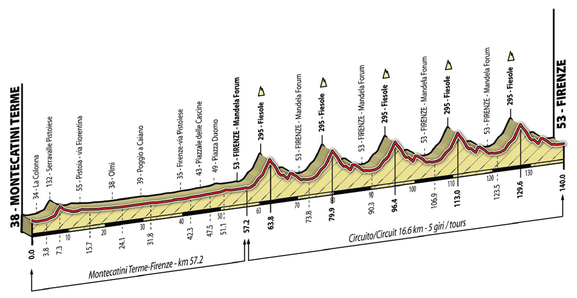 Como antedecentes de finales en Florencia, señalar que ya hubo una llegada en esta ciudad previo paso por Fiesole hace sólo unos meses, concretamente en la 9ª etapa del Giro de Italia, con triunfo para Maxim Belkov por delante de los colombiabos Betancur y Pantano -> clasificación. Inicialmente el trazado iba a incluir el circuito del Mundial -> perfil original, con Fiesole sur + Via Salvati, pero las obras en esta última carretera hicieron que finalmente se eliminara de la etapa, además de cambiar la vertiente de Fiesole.