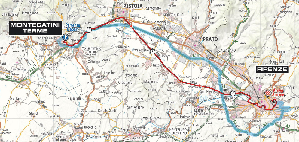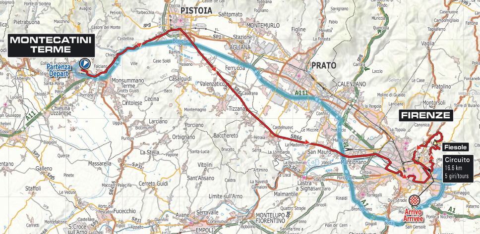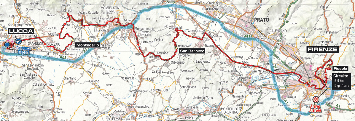 Una vez terminado el suave descenso de San Baronto, en la localidad de Casalguidi, se afonta la zona más sencilla del recorrido, con unos 40 km llanos por buena carretera y con larguísimas rectas hasta llegar a Florencia y hacer el primer paso por la línea de meta. Señalar que la mayor parte de ese tramo llano se hará por la SS66 Vía Pistoiese, la misma carretera de aproximación utilizada en el resto de pruebas.