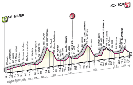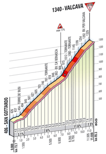 Los primeros 65 km son casi completamente llanos, pero a partir de ahí el terreno empieza a picar hacia arriba en busca de la dura ascensión a Valcava / Valico di Ca´Perrucini: una subida con 10 km finales al 8,8% de media y rampas máximas de hasta el 17%, formando parte de la lista de los km enteros más duros en competición al tener un tramo de 1000 m al 12,6 %. Un 1ª durísimo, rozando la categoría especial, y que puede provocar una gran selección en caso de que el ritmo sea elevado, siendo un buen lugar para que se forme una escapada con corredores de mucho nivel. Indicar que este puerto, recuperado en la edición de 2011, también se subió en el Giro de italia 2012, en una etapa con final en Piani dei Resinelli y victoria para Matteo Rabottini por delante de «Purito» -> perfil / clasificación.