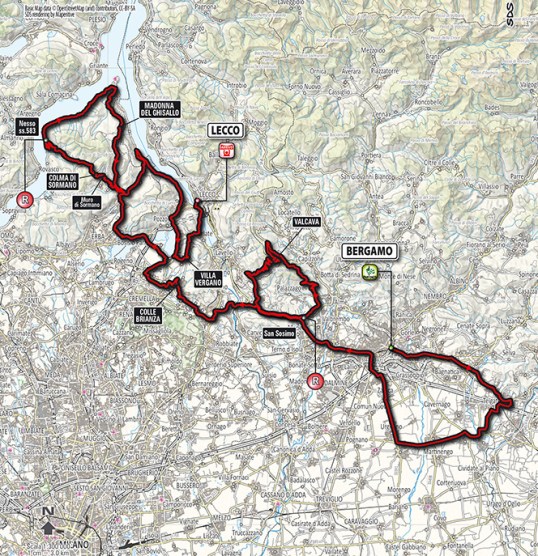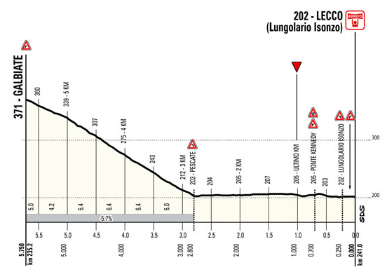 Después de coronar Vergano restarán sólo 9 km, los primeros 6 km de bajada regular al 4-6%, por una carretera con pocas curvas cerradas pero bastante estrecha, y los últimos 3 km casi completamente llanos, aunque con 3 giros bastante cerrados ya dentro del km final y las calles de Lecco, con una última recta de apenas 150 m hasta alcanzar la línea de meta, situada en Lungolario Isonzo al igual que en los últimos años.