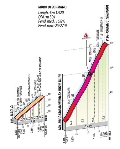 Una vez coronado, a 160 km de meta, largo descenso (primeros 4,3 km y después se toma otra carretera) por la vertiente SE antes de girar hacia el oeste y volver a pasar cerca del inicio del puerto, formando un bucle de unos 45 km, para a partir de ahí dirigirse hacia el norte en busca del tendido Colle Brianza, con 3 km finales al 5%. Después de su corta bajada hay 12 km completamente llanos antes de que el terreno empiece a picar hacia arriba en dirección a la Colma di Sormano, una ascensión con un primer tramo de 5 km muy regular al 6-7% y una parte final brutal, donde tras girar a la izquierda los corredores tendrán que afrontar el famoso Muro de Sormano: 1,8 km al 16,3% y puntas del 27% antes de regresar a la vía principal -> galería fotográfica, estando en la lista tanto de rampas máximas como de km enteros más duros superados en competición. Aunque está situado muy lejos de meta, este tramo debería dejar muy reducido el grupo de favoritos, si bien luego hay terreno para reagrupamientos.