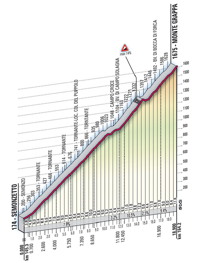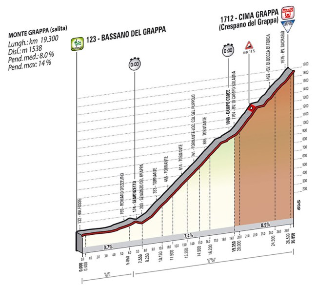 En la jornada siguiente le toca el turno a una etapa que puede ser todavía más importante para la clasificación general: la brutal cronoescalada al Monte Grappa por Semonzo, con una distancia de casi 27 km al incluir 7,5 km llanos antes de iniciar la subida, que con 19,3 km al 8% de media y largos tramos al 11% en su segunda mitad -> perfil detallado (falta el desvío final) se acerca a los 400 de coeficiente APM. Esta vertiente del Grappa, la más dura de las tres que se han utilizado en profesionales (aunque hay varias aún más rompedoras), fue estrenada en el Giro 2010 hasta la cota 1675 m, en una etapa con final en Asolo que resultó espectacular, consiguiendo la victoria Nibali tras un ataque en el descenso -> clasificación / vídeo. A pesar del llano inicial, una contrarreloj más favorable para los escaladores que para los propios rodadores y especialistas contra el crono.