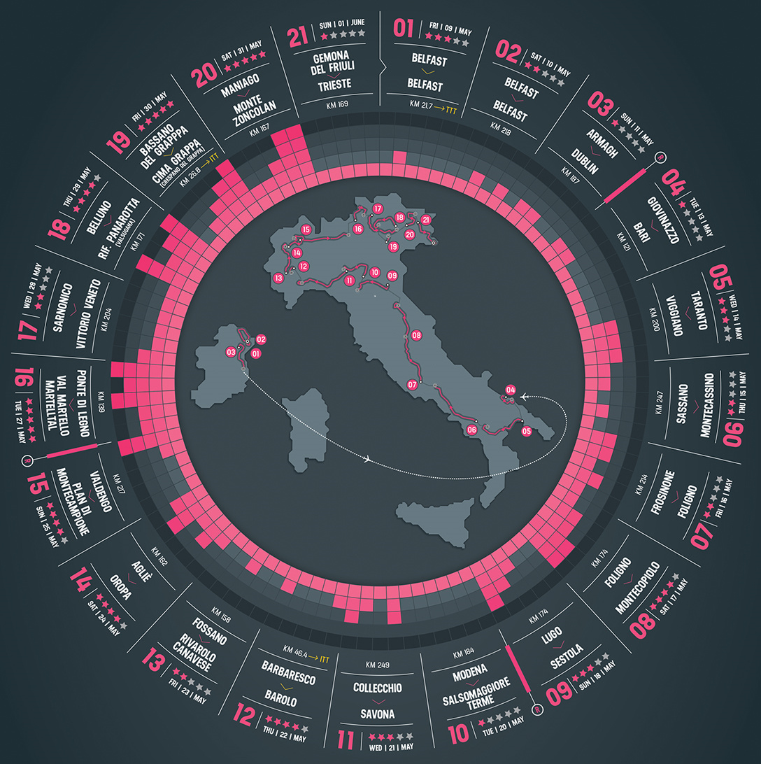 Dejando de lado el inicio en Irlanda, el trazado mantiene parte de las características de las últimas ediciones, en algunos casos llevándolas al extremo, como la gran cantidad de finales en alto, con 10 llegadas de este tipo (la mitad de ellas de categoría Especial), record histórico en el Giro; y la fuerte concentración de la dureza en los últimos días, con nada menos que 5 etapas de alta montaña y una cronoescalada durante los 8 días finales, aunque con una jornada de descanso intercalada, destacando el tríptico Panarotta-Grappa-Zoncolan. Señalar que la etapa de Val Martello, que incluye los míticos puertos de Gavia y Stelvio (Cima Coppi), es idéntica a la suspendida este año por un temporal de nieve.
