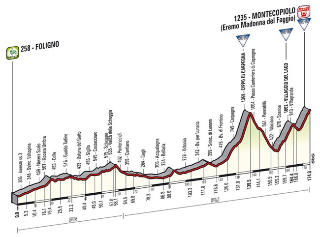 - 8ª etapa (17 de mayo): Foligno – Montecopiolo (174 km) -> mapa