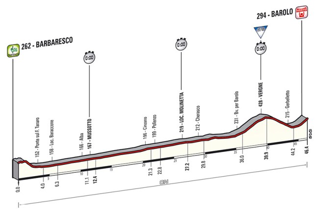 El pasado lunes se confirmó el recorrido (teóricamente) definitivo de la contrarreloj de Barolo, que salvo nuevos cambios tendrá 41,9 km y tres repechos, el primero de ellos puntuable -> https://twitter.com/giroditalia/status/440497644159242241/photo/1, frente a los 46,4 km del recorrido que se presentó inicialmente.