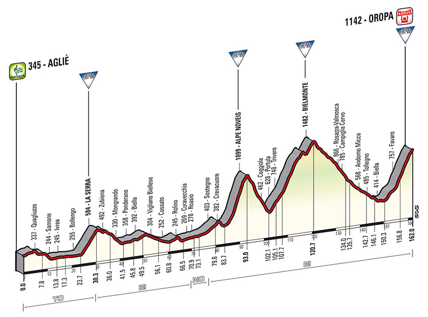 - 14ª etapa (24 de mayo): Aglié – Oropa (162 km) -> mapa