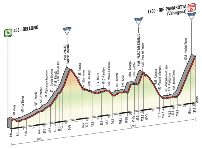 - 18ª etapa (29 de mayo): Belluno – Rifugio Panarotta (171 km) -> mapa