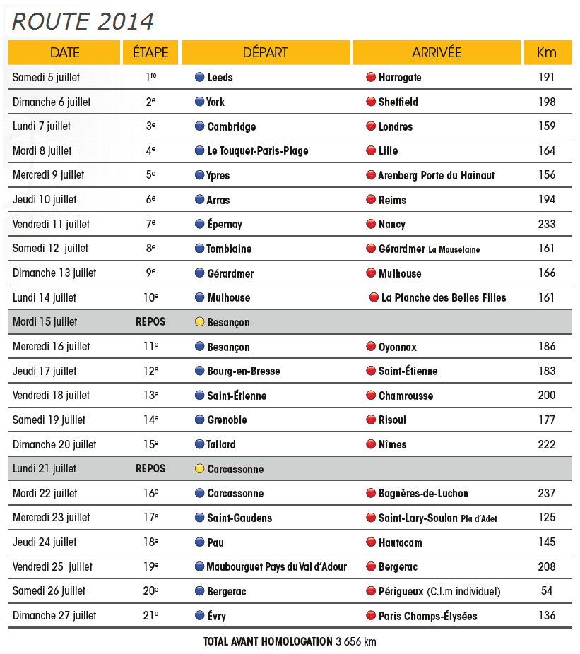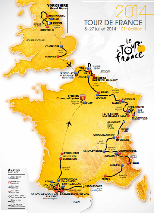 El pasado miércoles tuvo lugar en París la presentación oficial del recorrido del Tour de Francia 2014, la edición nº 101 de la carrera francesa, con inicio en el condado de Yorkshire, en el norte de Inglaterra, el 5 de julio, y llegada en París el día 27 del mismo mes, para un total de 3656 km divididos en 21 etapas.