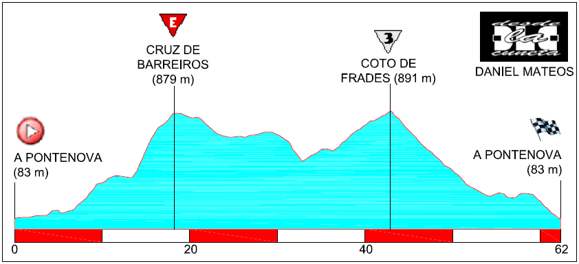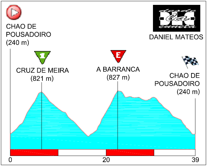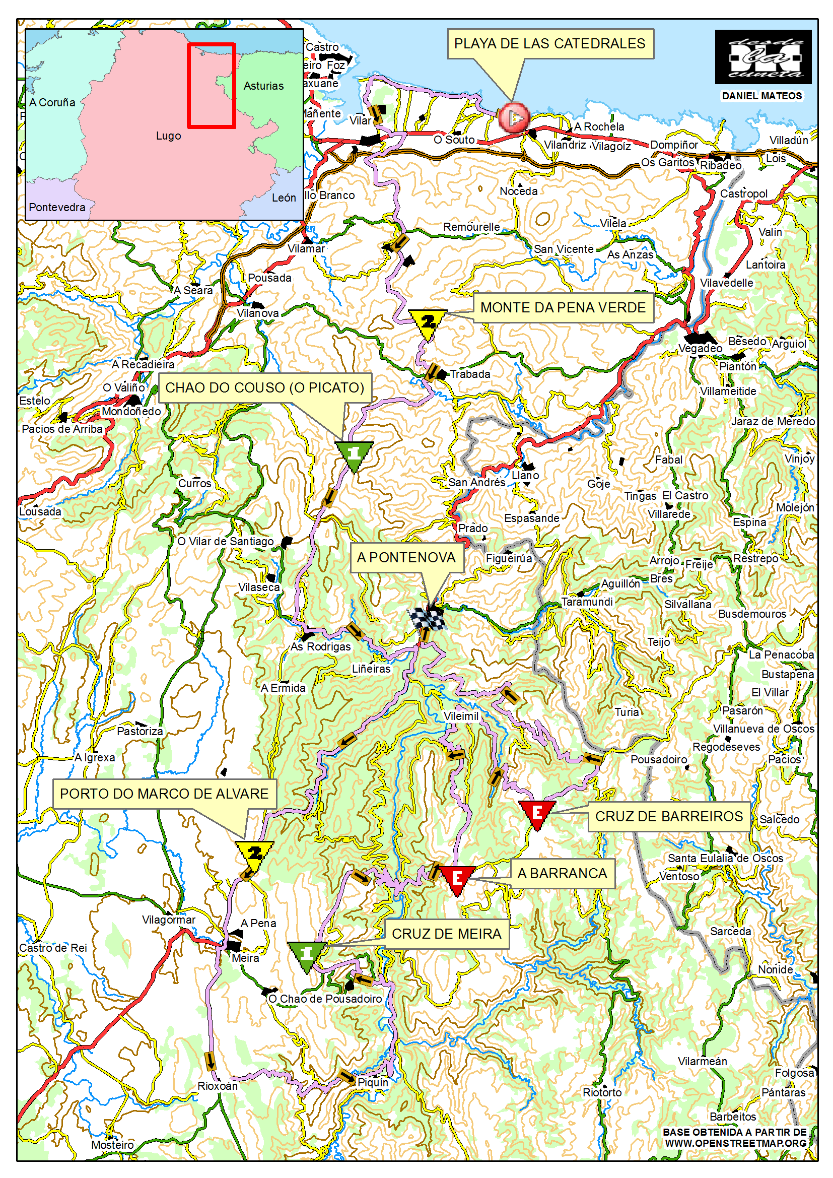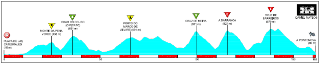Partiendo de la atrayente Playa de las Catedrales y sus espectaculares arcos, se recorre el litoral de Barreiros para encarar el primer tramo de la etapa, en dirección sur, por los puertos de Monte da Pena Verde y Chao do Couso (O Picato), antes de bajar hacia la nacional y encarar la subida a la localidad de Meira por el Porto do Marco de Alvare, justo antes de ingresar en la zona decisiva, el encadenado perfecto de los 3 puertos del reportaje, además incrementando la dureza paulatinamente hasta alcanzar la línea de meta en A Pontenova, junto a las ruinas de las minas de Vilaoudriz.
