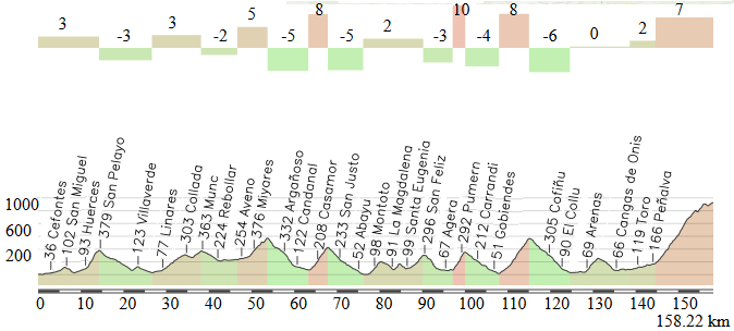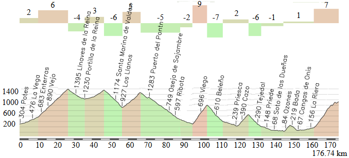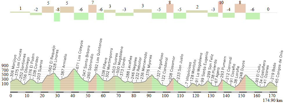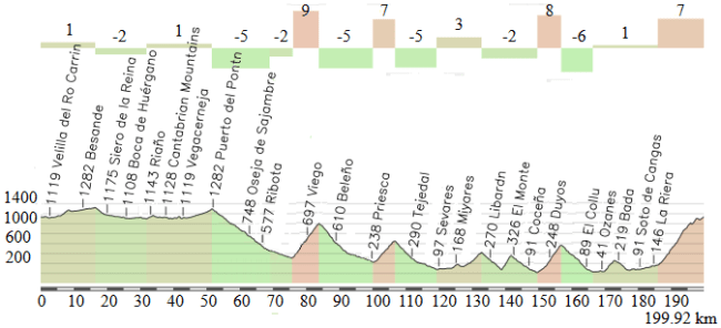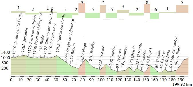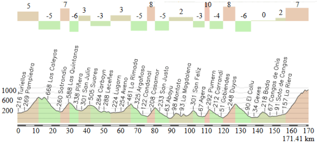 Incluso cabría la posibilidad de endurecer aún más la etapa si la salida estuviera en la zona interior. Por ejemplo, con inicio en Oviedo se podrían incluir la Manzaneda + Padrún (de derecha a izquierda); Vegalafonte, 3,5 km iniciales al 10% hasta un altillo; Colladiela S, con 5 km finales al 8% de media; La Casilla, que tiene 4,4 km a más del 8%; y La Cruz antes de llegar a Pola de Siero, para un total de 197 km y alrededor de 5500 m de desnivel en caso de completar la ruta mencionada entre Pola y Lagos, aunque creemos que un recorrido de este tipo se aprovecharía mejor si la etapa no acabara en alto, terminando en Cangas de Onís para favorecer la batalla desde lejos. Si se quiere mantener la llegada en Lagos sin pasar de los 5000 m de desnivel bastaría con quitar los primeros puertos, por ejemplo saliendo desde Langreo y con la Colladiela por Ciaño como subida inicial, con un primer alto, La Mozqueta, que cuenta con un tramo de 6 km al 8,5% de media.