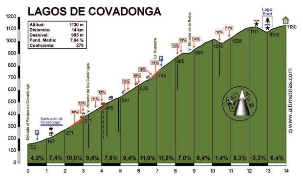 La dura ascensión a los Lagos de Covadonga. Perfil de APM, click para ver descripción detallada
