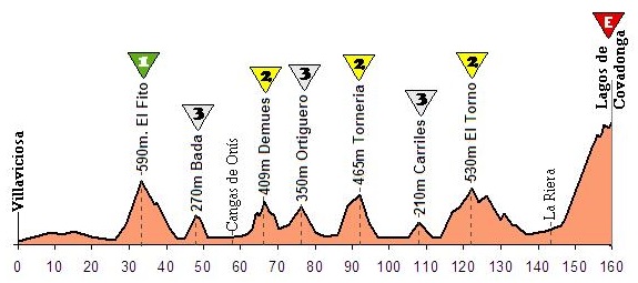 Otra opción sería hacer alguna vez la etapa en forma de cronoescalada, con una distancia rondando los 23 km si la salida estuviera en Cangas de Onís: los primeros 9 km relativamente llanos (aunque picando hacia arriba) y los últimos 14 km de subida a Los Lagos. Este tipo de cronos mixtas suelen dar mucho juego y además en este caso, junto a los alicientes deportivos, tendría el bonus de la belleza de la zona y la más que probable gran asistencia de público. Quizás la mayor pega fuera el tema logístico, al no haber otra carretera de evacuación, pero ya se han hecho cronoescaladas a subidas de una sola vertiente y no habido grandes problemas.