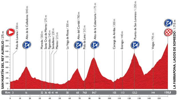 Pero si estas 2 etapas ya son exigentes son sólo un aperitivo de lo que espera a los corredores. Y es que como final del tríptico llega una de las jornadas más duras en la historia de la Vuelta, con 5 puertos, los 2 primeros de 2ª y los 3 últimos Especiales (aunque los organizadores han marcado todos de 1ª): la Cobertoria E, que por fin se estrena como subida en la Vuelta; San Lorenzo, con los últimos 5,7 km a casi el 11% de media; y la Farrapona, con 6,5 km finales muy constantes al 8-9%. En total, 4400 m de desnivel acumulado y bastantes km por encima del 10%, pudiendo entrar en la lista de etapas más exigentes de la historia. La anterior llegada en la Farrapona, también con San Lorenzo como penúltimo puerto (aunque incluyendo menor dureza previa), se produjo en 2011, con triunfo para Rein Taaramae por delante de Juanjo Cobo -> vídeo / clasificación, a la postre vencedor de la Vuelta.