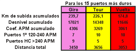 En las siguientes tablas se muestran los datos de los 15 puertos más duros de cada carrera, ordenados de mayor a menor dureza según su coeficiente APM, aunque en el caso del Giro hemos añadido Naso di Gatto pues también alcanzaría la Primera Categoría. Los puertos de Especial se marcan en verde y los de 1ª en marrón. Click en las imágenes para ampliarlas:
