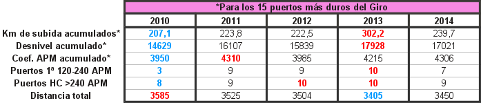 Analizando la evolución de los últimos cinco Giros, lo primero que salta a la vista es que el Giro 2010 fue el que menos dureza tenía en su montaña… algo sorprendente dada la gran exigencia de aquella edición, que fue de lo más comentado en la misma, con quejas incluso de algunos profesionales o periodistas, y que a su vez resultó la Gran Vuelta más espectacular y emocionante de los últimos tiempos. Las críticas a la dureza de la prueba arrecieron en 2011, pero de nuevo comprobamos como las últimas ediciones han sido tan o más exigentes como aquella. Y 2014 no le va a la zaga con 4300 puntos de APM y más de 17000 m de desnivel acumulado en los 15 puertos más duros.