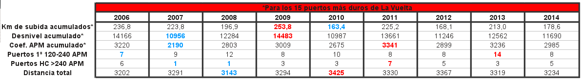 3. En primer lugar, enhorabuena por el trabajo. Me han dejado un poco frío los datos de La Vuelta ya que pensaba, viendo los perfiles, que iba a estar por encima del Tour este año, y ni con esas. Es más, si se introduce un segundo filtro en la categoría de los puertos, como por ejemplo el desnivel acumulado (Una escala podría ser algo así como: HC necesario apm 240 y desnivel 1000 m, y 1ª apm 120 y desnivel 500 metros, 2ª apm 60 y desnivel mínimo 250 m, 3ª apm 30 y desnivel mínimo 125), la lista de puertos se nos queda muy muy mermada. Una pena, oportunidad perdida, a pesar que con algunos retoques podía quedar Una Vuelta muy decente (+ crono, Ancares de paso, y Haza Llana en la etapa de La Zubia)
