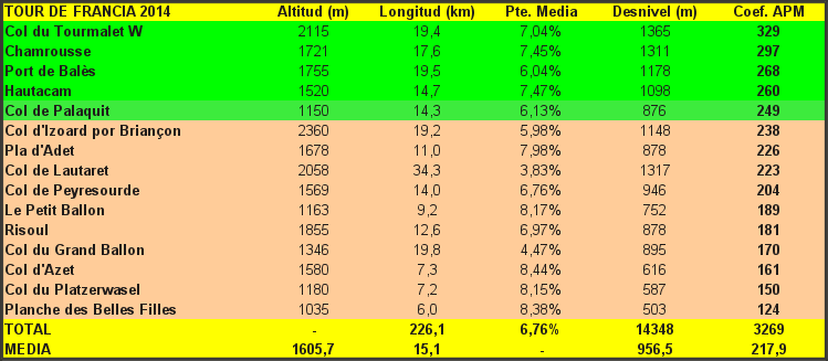 Las anteriores cuatro ediciones de la Grande Boucle han tenido números siempre en torno a los 230km de subida, más de 15.000 m de desnivel y alrededor de 3600 APM. Por eso, el bajón de dureza en 2014 sorprende más por ser algo inesperado que por ser una gran rebaja en sí. Lo peor es la tendencia: cuando el Tour debería buscar más dureza en su montaña, para mejorar un espectáculo muchas veces escaso a la vez que se compensan las mejoras en bicicletas, desarrollos, técnicas de entrenamiento, carreteras o nivel de los gregarios, ASO escoge el rumbo contrario, empequeñeciendo la alta montaña francesa. De hecho, únicamente se sube un puerto por encima de los 300 APM: el Tourmalet.
