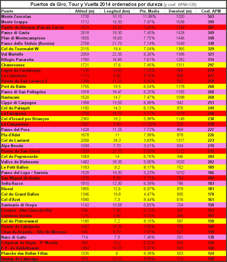 Por último, presentamos la tabla con todos los puertos por encima de 120 APM de las tres grandes de 2014, ordenados por dureza y marcando con colores la carrera a la que pertenecen: rojo Vuelta, rosa Giro y amarillo Tour.