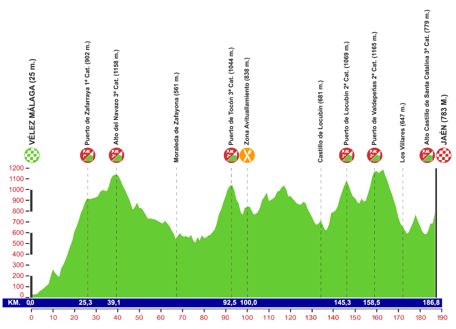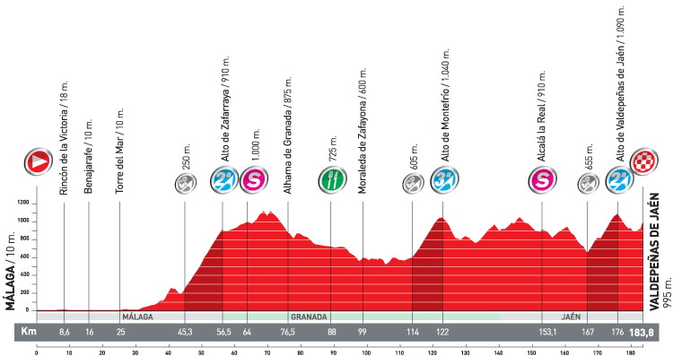 Al ya clásico Boquete de Zafarraya, sin rampas duras pero largo y muy constante al 6%, lo van a acompañar el Navazo; el Puerto de Tocón, marcado de 3ª aunque se puede considerar un 2ª; el Puerto de Locubín, también bastante regular al 6% salvo por un descenso intermedio; el Puerto de Valdepeñas/Ranera, que con el nuevo trazado de la carretera ha ganado pendiente, contando ahora con 2 km centrales a más del 8%; y el ascenso final al Castillo de Santa Catalina, irregular pero con rampas de hasta el 17%. Y todo ello sin contar un buen número de repechos que han quedado sin puntuar, como la subida «en escalera» a Venta de Agramaderos-La Pedriza y ya más cerca de meta la cota del Caserío de la Condesa, con 3 km al 5,7%.