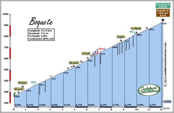 - Boquete de Zafarraya, 1ª (km 25,3): 902 m – 11,8 km – 5,9%