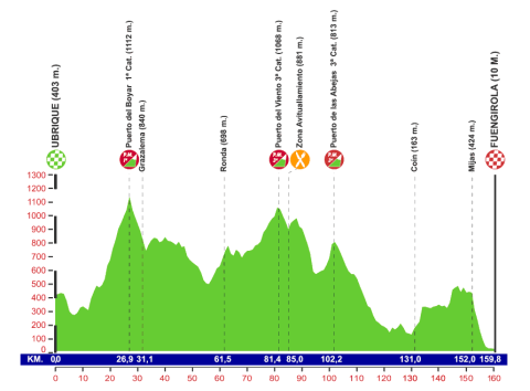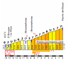 Casi de salida los corredores tendrán que afrontar el precioso Puerto del Boyar, todo un 1ª con alrededor de 900 m de desnivel acumulado y una parte central muy constante al 7-8%, para tras su descenso hasta el Puerto de los Alamillos y una zona de falsos llanos dirigirse hacia Ronda y atravesar la serranía homónima, con el Puerto del Viento y el Puerto de las Abejas por su vertiente más suave y algún repecho sin puntuar, como la propia subida hasta Ronda, con algo más de 6 km al 4%, o el tendido repecho antes de llegar a El Burgo.