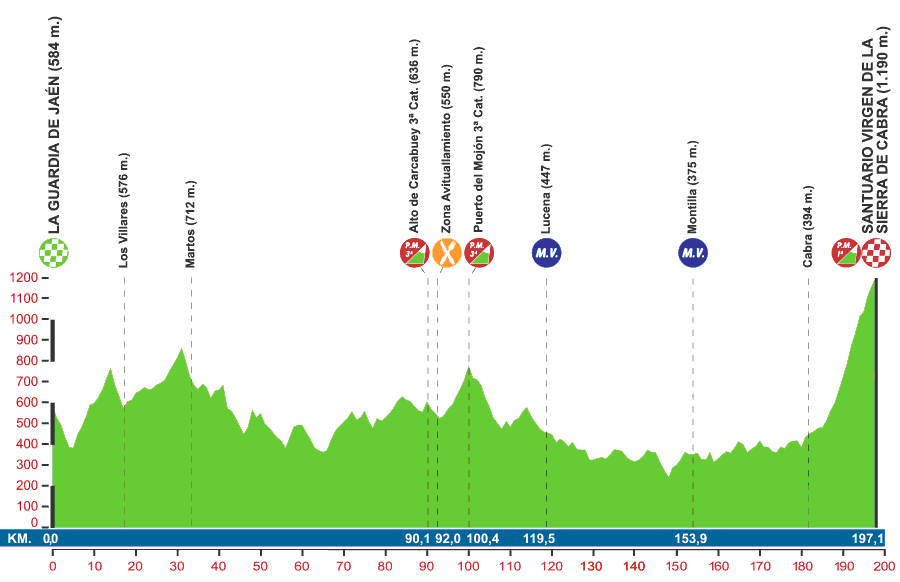 La siguiente etapa se inicia en La Guardia de Jaén, una localidad de larga tradición en la carrera, para adentrarse nuevamente en las Sierras Subbéticas camino de una de las cimas míticas de la ronda andaluza, el Santuario de la Virgen de la Sierra, junto a la localidad de Cabra, cuya cima se alcanzará tras casi 200 km de etapa.