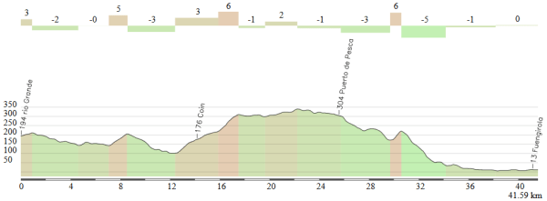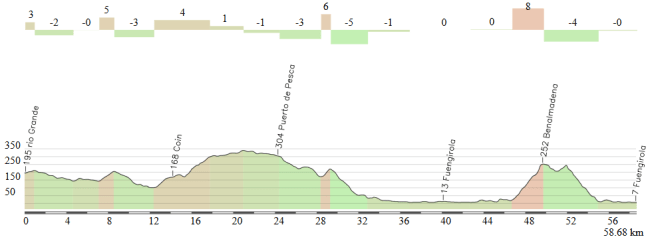 El largo descenso del Puerto de las Abejas llevará a los corredores hasta las cercanías de Coin, donde poco antes de esta localidad se inicia un largo repecho que si bien está puntuado se podría considerar perfectamente un 3ª, con unas cifras totales de 5 km al 4,2% de media. Terminada la subida habrá una nueva zona de falsos llanos antes de llegar al cruce de Puerto de los Pescadores y comenzar un irregular descenso (de derecha a izquierda a partir del km 9,7), con repecho intermedio incluído, en dirección a Fuengirola, con los últimos 7 km antes de meta ya casi totalmente planos.