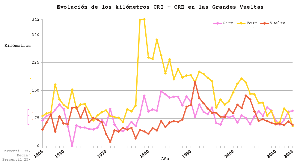 Hemos editado la entrada actualizando los tres gráficos tras darnos cuenta de varios errores: en los datos de CRI del Tour, habíamos dejado sin sumar dos cronos, una en 1970 y otra en 1982. Con este cambio, 1970 deja de ser, como representábamos antes, la edición del Tour con menos crono, una dudosa distinción que pasa al Tour 2014. Por otro lado, el Tour de 1982 destaca ahora como una de las ediciones donde había programados más kilómetros de contrarreloj (rozando los 300 km), si bien una de las CRE al final no se disputó.