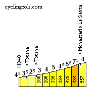 Aclarar que los perfiles de la etapa que hay a continuación son de elaboración propia (realizados mediante la página de tracks4biker y corrigiendo después algunos fallos), ya que el oficial deja que mucho que desear, tanto por su exagerada escala vertical como por no mantener ninguna escala en las distancias. En cualquier caso, también está enlazado.