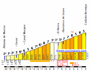El año pasado, pese a la reducción a sólo una etapa, el Collado Bermejo siguió siendo la gran dificultad orográfica de la prueba, si bien colocado muy lejos de meta al acabar en el Castillo de Lorca, «la fortaleza del sol», con un tracionero repecho final de 2km al 5-6% de media y rampas máximas superando el 10%