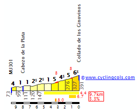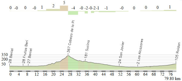Tras varios km de salida neutralizada, el inicio real de la prueba tendrá lugar en la Avenida Calvo Sotelo, en la pequeña localidad de Beniel, con un circuito de unos 9 km en torno a esta población antes de dirigirse hacia el sur en busca del Alto Cabezo de la Plata, también conocido como el Collado de los Ginovinos. La ascensión se puede dividir en 2 partes muy distintas: una primera mitad completamente irregular, donde a cada tramo de subida le sigue un pequeño descenso intermedio; y los últimos 4 km, en general constantes al 5-6%. Un 3ª donde es probable que haya múltiples intentos de fuga buscando formar la escapada del día.