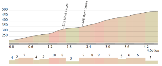 - Côte du Mont Meaulx, 3ª (km 180): 278 m – 1,7 km – 4,3 %