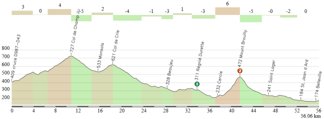 - Col de Brouilly, 3ª (km 26,5): 333 m – 1,8 km – 5,1 %