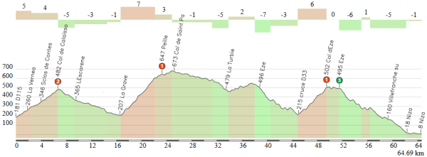 - Côte de Peille, 1ª (km 88): 653 m – 6,6 km – 6,8 %