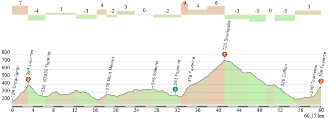 Los últimos 60 km, con Bourigaille y doble paso por Fayence (*las categorías son las oficiales). Click para ver el mapa