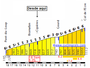 - Col de l’Ecre, 1ª (km 85): 1119 m – 11,1 km – 4,9 %