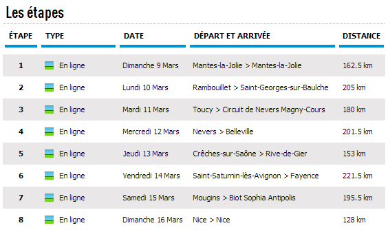 Asi pues, la carrera se inicia con 3 etapas llanas, de diferentes kilometrajes pero teniendo en común la amenaza del viento y la posible formación de abanicos, que en esta prueba suelen hacer de las suyas. A partir de la 4ª jornada le toca el turno a la media montaña, con 2 etapas seguidas en las que el último puerto se encuentra a menos de 15 km de meta: Belleville, con el explosivo Mont Brouilly, 3 km al 8%; y Rive de Gier, con un circuito final que incluye la tendida subida a Sainte Catherine. La 6ª etapa es la más larga de esta edición, con 221 km y un último tercio donde los ciclistas tendrán que superar varias cotas, incluída la meta en Fayence, y el Col de Bourigaille (hasta el km 1,4 y con un inicio distinto), con 8 km al 6%. Al día siguiente llegada en Biot, en una etapa dura pero con los puertos muy lejos de meta e incluyendo un circuito final de «sube y baja» constante. Y como despedida, se recupera la clásica etapa circular de Niza, con el Col d´Eze como último puerto, si bien afrontando Peille (hasta el km 3,8) en lugar de Turbie.